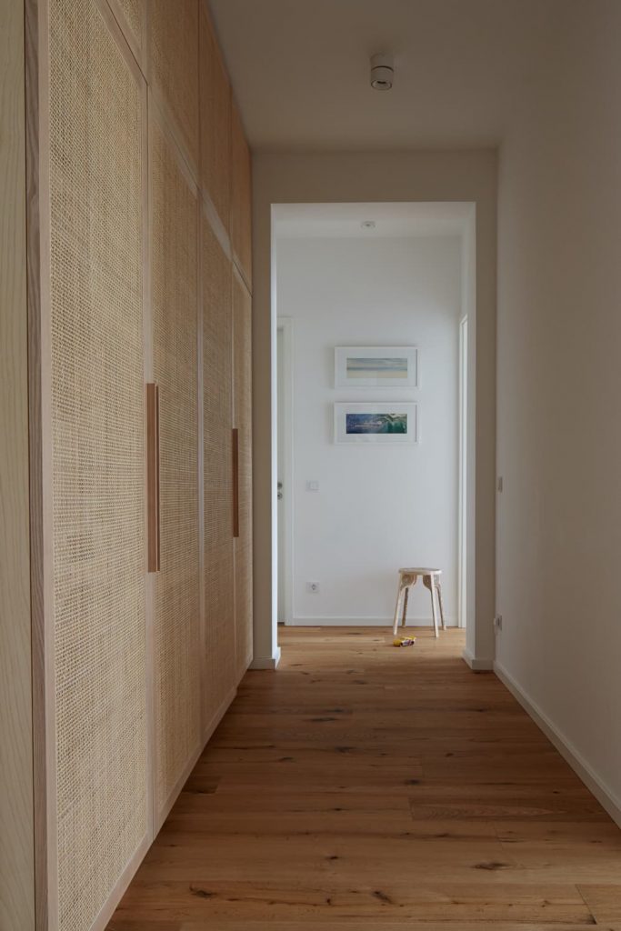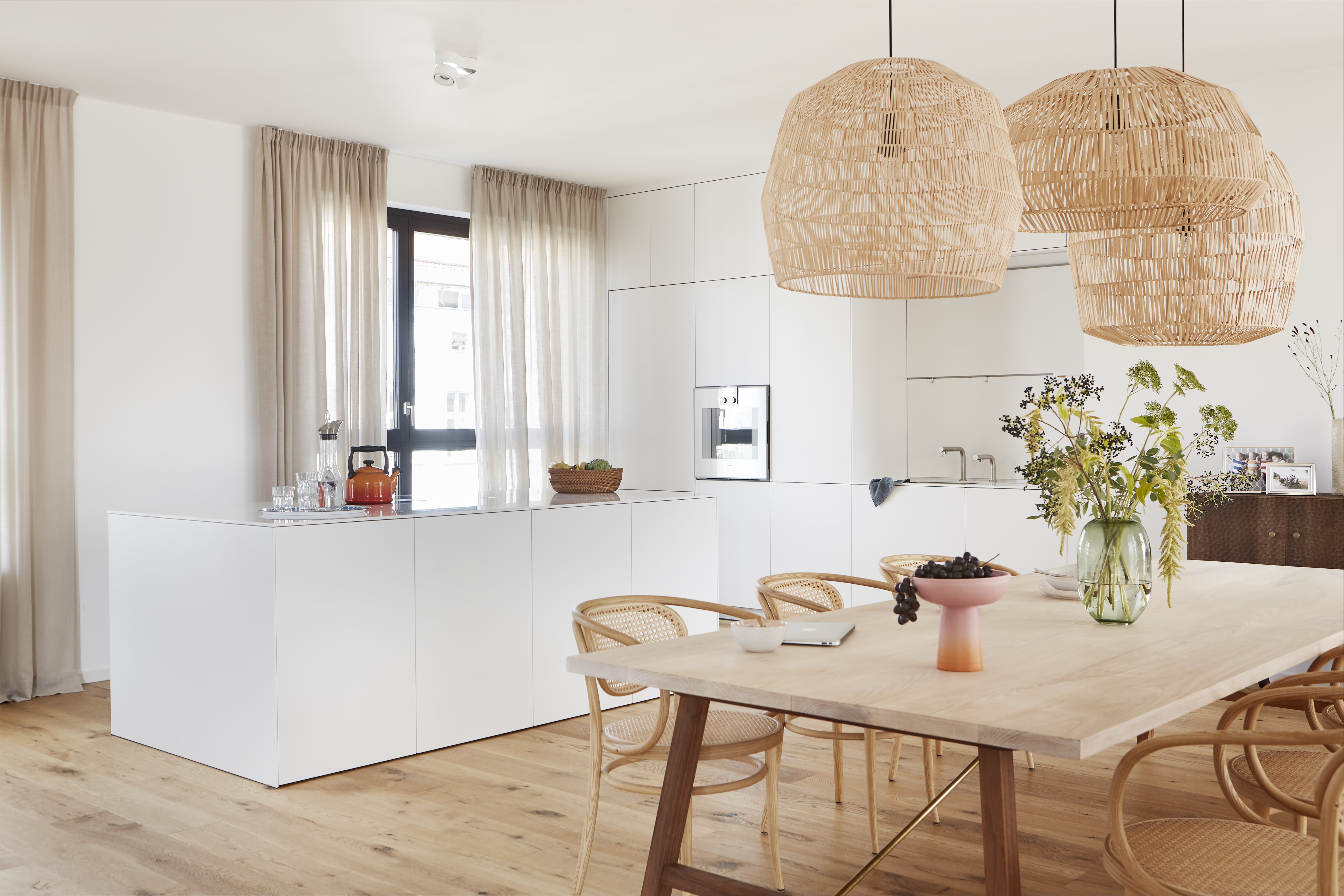 Um ein harmonisches Raumbild zu schaffen und die architektonische Geradlinigkeit aufzulockern, haben wir organische Formen und Materialien – z.B. in Form der Rattan-Lampen von Ay Illuminate und Gardinen aus einem leichten Leinen-Mischgewebe – hinzugefügt.“